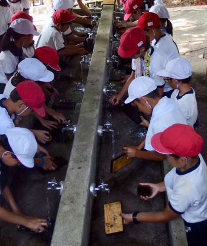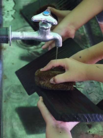 焼き板に記名をすませたら、水で洗い、板についたススを落とします。