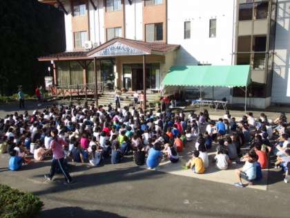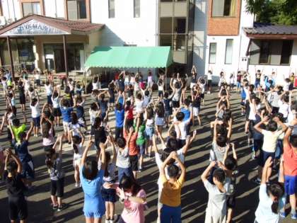 ドラえもんバージョンのラジオ体操、2日目も子どもたちの笑いを誘いました。