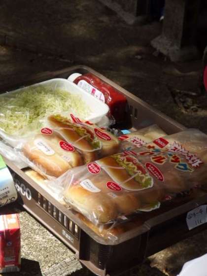 ホットドッグ用のパンに、キャベツ、ソーセージを挟んでホイルに包みます。