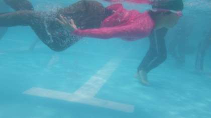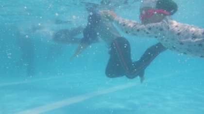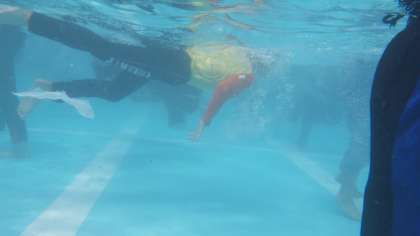 着衣泳の水中でのようすです。やはり泳ぎにくいようです。