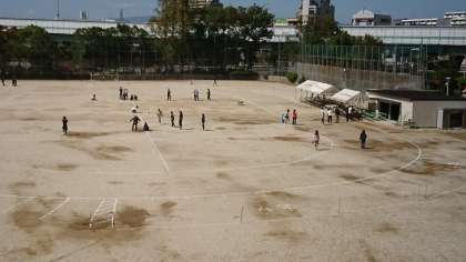 今、運動場では、教職員が明日の運動会開催に向けて着々と準備を進めています。