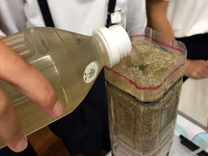 はじめに、ペットボトルに砂を入れ、即席のろ過装置を作成。