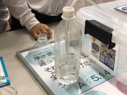 そこに汚れた水をいれると、あっという間に透明に水になって、下から出てきました。子どもたちには不思議だったようで、「おー!」という声が各グループから出ていました。