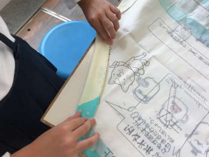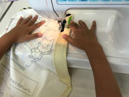 前もってアイロンで折り目をつけておき、点線に合わせて、ゆっくりとミシンの糸を進ませます。返しぬいも忘れずに、丁寧に縫っています。