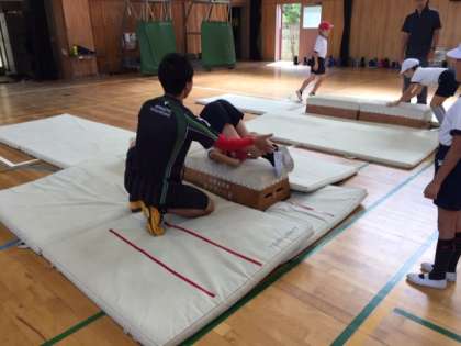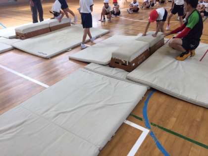本日、3年生が講師の方の指導のもと、台上前転にチャレンジしました。