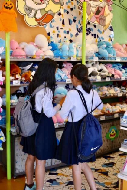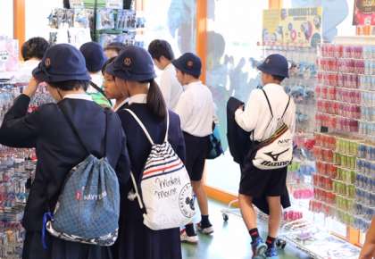 おみやげ選びも修学旅行の楽しみの1つ。少し疲れたような表情で店に入ってきますが、買い物をすませるとまたアトラクションに向かっていきます。