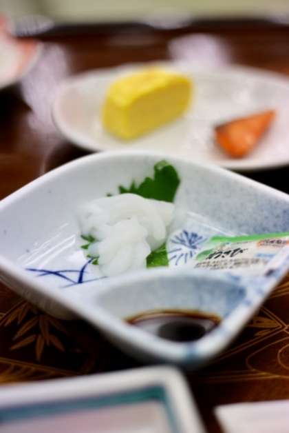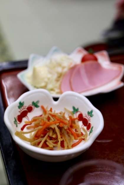 今日の朝ご飯は、ご飯、みそ汁、卵焼き、焼き鮭、厚揚げの煮物、イカの刺身、きんぴらごぼう、サラダです。