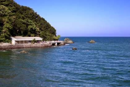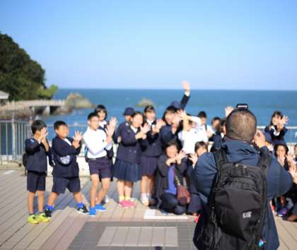 二見プラザに到着。夫婦岩が見える場所で記念撮影をします。