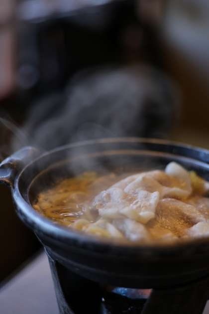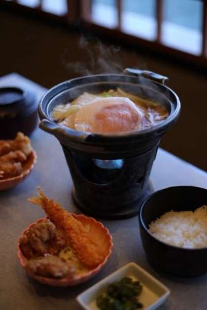 昼ごはんは、ご飯、漬物、豚肉の鍋、海老フライ、唐揚げです。