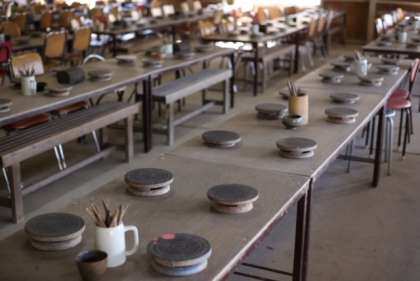 陶芸体験は、粘土と水以外には、ろくろと竹ひご、竹のヘラだけを使います。