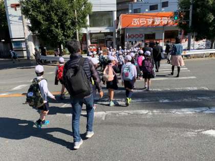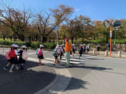 道路を横断するときは、教員の他にも、管理作業員や生活指導支援員が横断の見守りをしています。