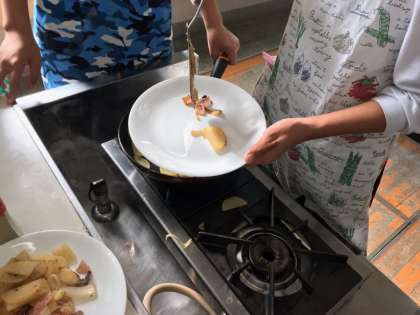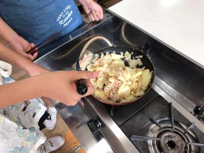 こしょうや塩などの調味料の加減が難しいようで、グループで協力しておいしいジャーマンポテトを作っています。