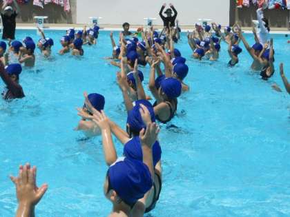 1年生が本校の大きなプールで元気よく水遊びやスキップで走ったりしていました。