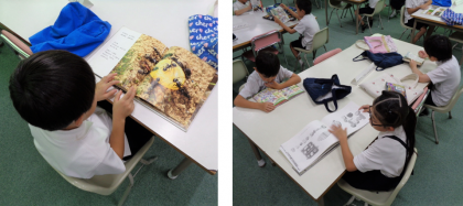 子ども達は自分の気に入った本を机で読んだり、グループで相談して決めた本をフリースペースでひろげて読んだりと楽しそうに過ごしていました。