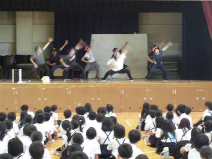 今回のスマイル集会では、運動会で子どもたちが踊るダンスを先生たちで発表しました。