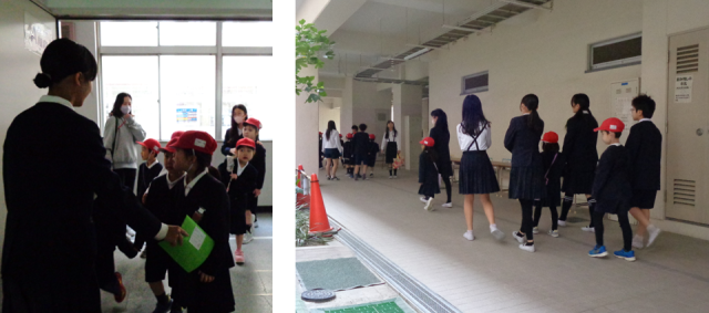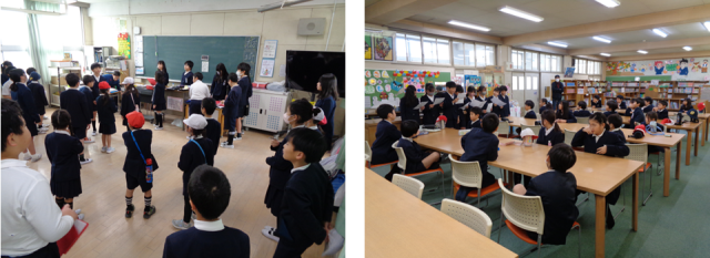 分校から1・2年生が来校し、6年生のお兄さんお姉さんに連れられて班ごとの活動教室に入りました。