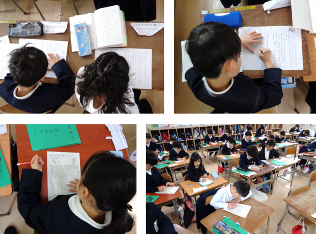 教室では国語「わたし(ぼく)のたからもの」と題した作文を書いていました。