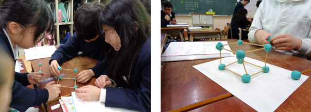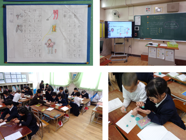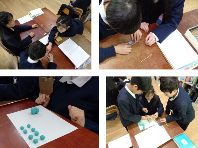 次の教室では、算数の時間に100ます計算や竹ひごと粘土を使った立体模型づくりなど、どのクラスも工夫を凝らした授業をすすめていました。