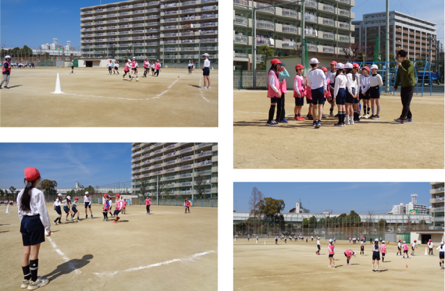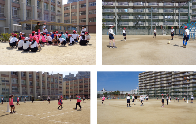 体をほぐした後、パスの練習、ミニサッカーゲームとチームごとに力いっぱい走っていました。