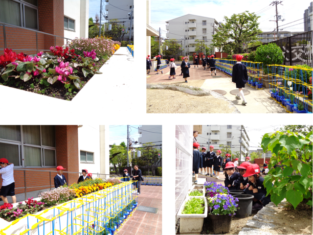 4月14日(火) 今日は日中暖かい陽気で、PTA緑化委員の方による花壇の花もたくさん咲いていました。