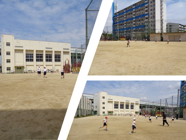 運動場では2年生が体育の学習で、敷地いっぱい元気よく走り回っていました。