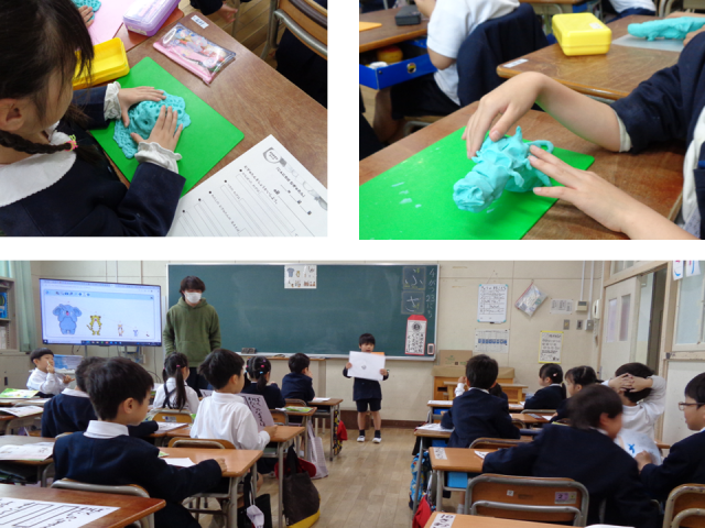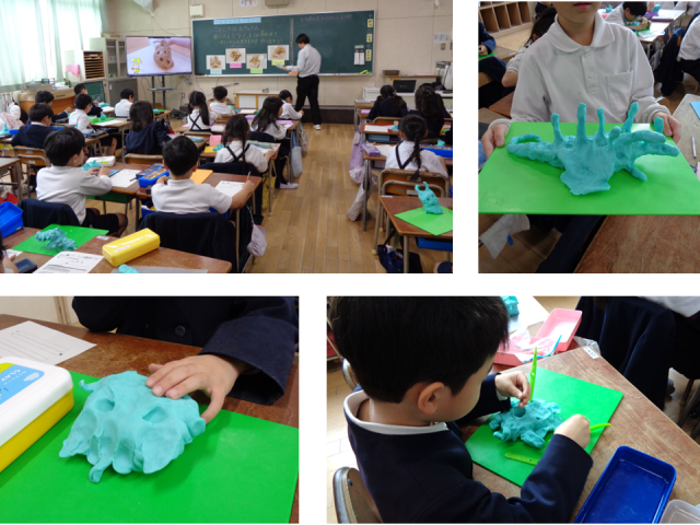 2年生では図画工作科「こんにちは むぎゅたん」より、粘土を使った仮想の生き物づくりをしていました。