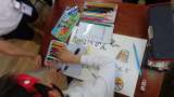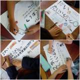 1年生に分校のことを紹介するために、画用紙に絵や文を書いています。