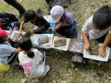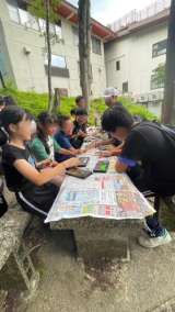 昨日磨いた焼き板に、今日は絵の具で色をつけて絵を描きました。班のみんなで見せ合い...
