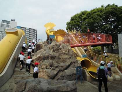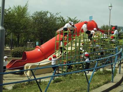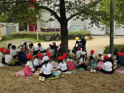 今日(26日)は春の遠足でした。1・2年生は扇町公園へ行きました。雨に降られることなく、滑り台などの遊具で遊んだり、春の草花を見つけたりして、たくさん楽しむことができました。着いたのが早かったので、午前中は遊具の場所がすいていて、みんなおもいっきり遊べたようです。公園の木陰でお弁当を食べ、午後も楽しく活動しました。