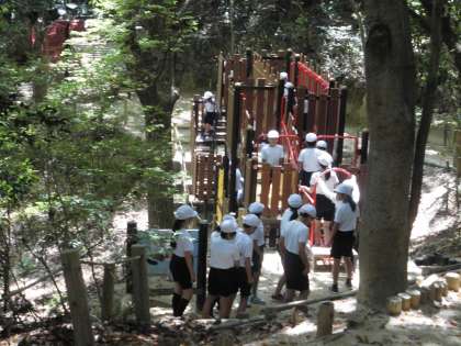 アスレチックでは、綱渡りなどたくさんのアトラクションがあり、ゴール目指して班の友だちと一緒に楽しく活動しました。たくさん体を動かした後はお弁当タイム。おいしくいただきました。そして、遊具のある公園へ移動し、大きなすべり台やおにごっこなどをしながら楽しみました。