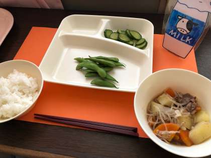 肉じゃが きゅうりのかつお梅風味 えだまめ ごはん 牛乳