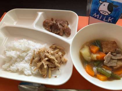 鶏肉のてり焼き じゃがいもとあつあげの煮もの ごまかかいため ごはん 牛乳