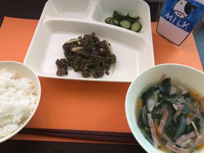 チンジャオニューロウスー ハムと野菜の中華スープ きゅうりの辛みづけ ごはん 牛乳