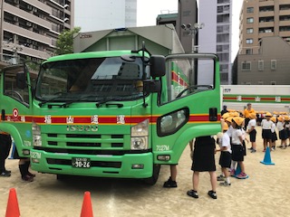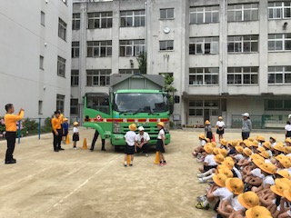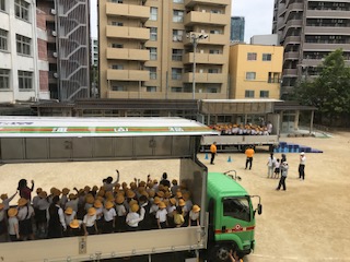 道路への飛び出しがどんなに危険かを、トラックを使って実演していただきました。また、歩行時や自転車乗車時の注意点なども、具体的に教えていただきました。最後には、トラックの運転席に座らせていただき、「車のまわりには、運転者から見えない範囲が多くあること」を体験で知ることができました。