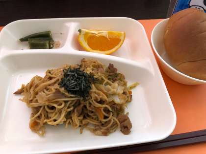 焼きそば オクラのかつお梅風味 オレンジ 1/2黒糖パン 牛乳