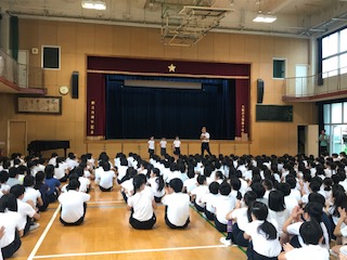 今朝の児童朝会で、本校に体験入学に来ている児童の紹介がありました。海外の学校ではすでに夏休みに入っているため、その期間を利用して、日本の学校で学習しています。短い期間ではありますが、いろんな経験をして、たくさん思い出を作ってほしいと思います。