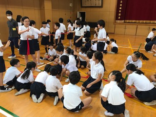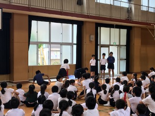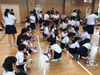 今朝(5日)の児童集会は、「長さ当てクイズ」でした。「上り棒の長さ」や「手洗い場の横の長さ」など、学校にあるものの長さを、ハチマキ何本分かで考えて、答えていました。たてわり班で協力して、ハチマキを並べていました。