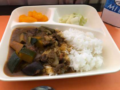 夏野菜のカレーライス キャベツのサラダ みかん缶 牛乳