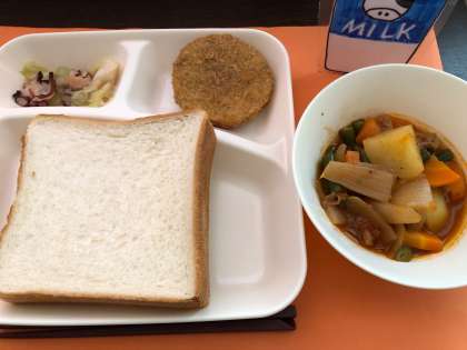 レバーの入ったメンチカツは、カレー味で「レバー」だとはわかりにくく「カツめちゃうまい!」といつも評判です。しっかりと給食をいただいたので今日の暑さも乗り超えられると思います。