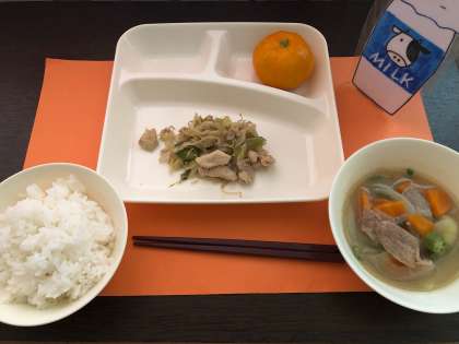ピリ辛野菜いため オクラとん汁 みかん(冷凍) ごはん 牛乳