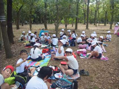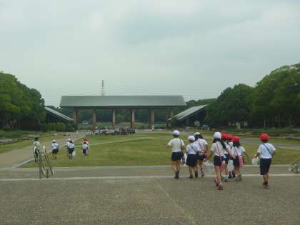 1・2年生は、大泉緑地に行きました。天気予報では雨が心配されましたが、日中は青空も見られ、過ごしやすい一日でした。1年生とグループになって、ネイチャーオリエンテーリングをしたり、いろいろな遊具で遊んだりしました。汗をぬぐいながら、元気いっぱいに活動をしました。