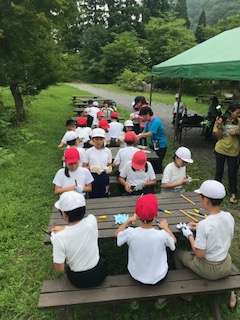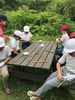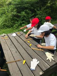 これから3日間使う箸を作っています。小刀を使って、一生懸命竹を削っています。