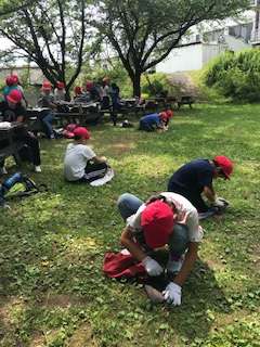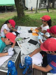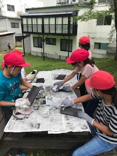 焼き板工作が始まりました。板の煤をごしごし、こすっています。板の目が見えるまで頑張っています。