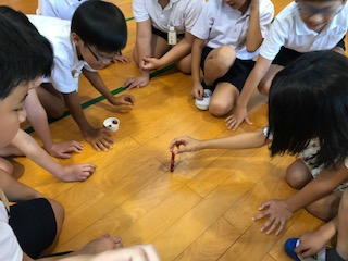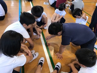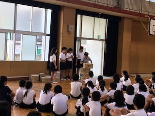 今朝の児童集会は「積んで積んで」ゲームでした。たてわり班ごとに円になって座り、小さな積み木を積み上げていきます。何度も崩れながらも慎重に積み上げていきました。3分間で一番多く積み上げたチームが勝ちです。1位のチームは、なんと18個も積み上げていました。