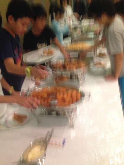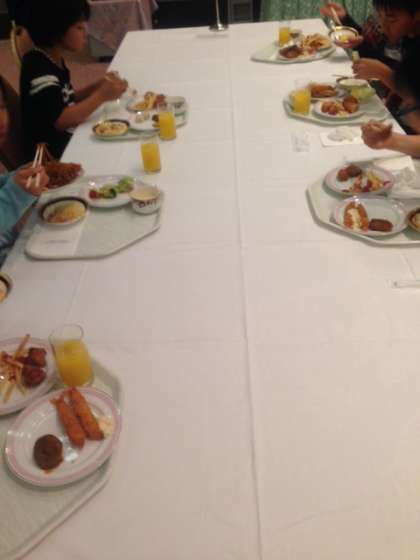 大きな広間を使っての夕食。食べたいものをいっぱい食べました。写真がぶれてしまい申し訳ありません。