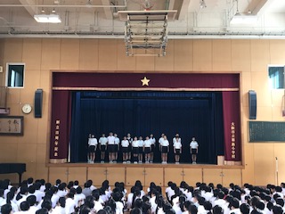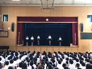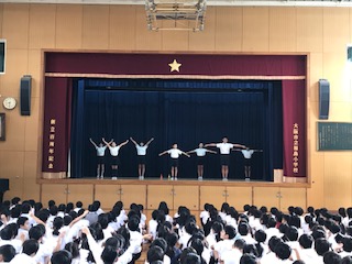 今朝(7日)の児童朝会で、運動委員会の発表がありました。運動会の時の体操や、体育倉庫の掃除など、運動委員会の子たちが日ごろどのような仕事をしているか、舞台で実際にやってみて、わかりやすく説明してくれました。