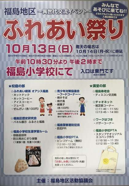 地域行事「ふれあいまつり」が、10月13日(日)に行われます。福島小学校校庭で、午前10時30分から午後2時までです。ぜひ、ご参加ください。