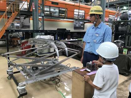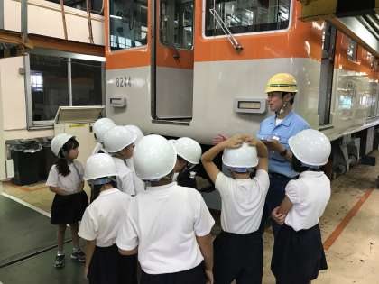 尼崎車両基地へ見学に行きました。車両基地までは自分で切符を買い、電車で行きました。初めて切符を買う子どもも多かったですが、無事全員乗車することができました。車両基地の中は、普段見ることができないところも見せてもらい、興味津々で活動し、最後にはお土産もいただきました。