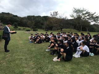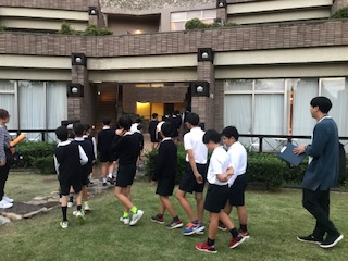 開舎式の後、荷物を部屋に置いてから、ホテルの庭で避難訓練を行いました。