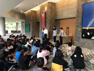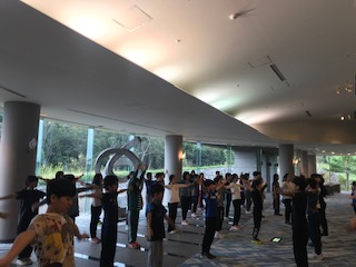 お天気が少し悪いので、昨日の開舎式の会場で、朝の会を行いました。